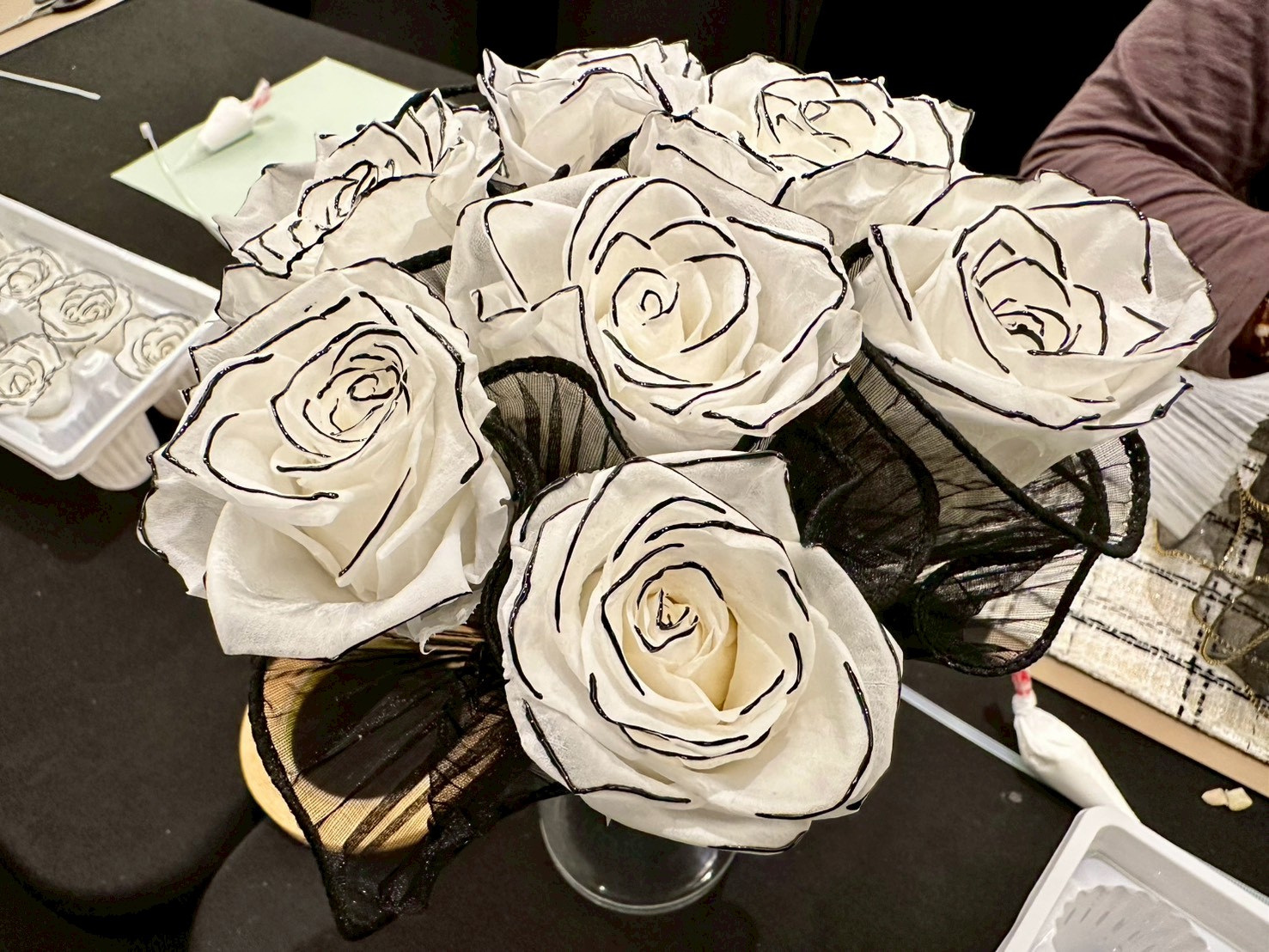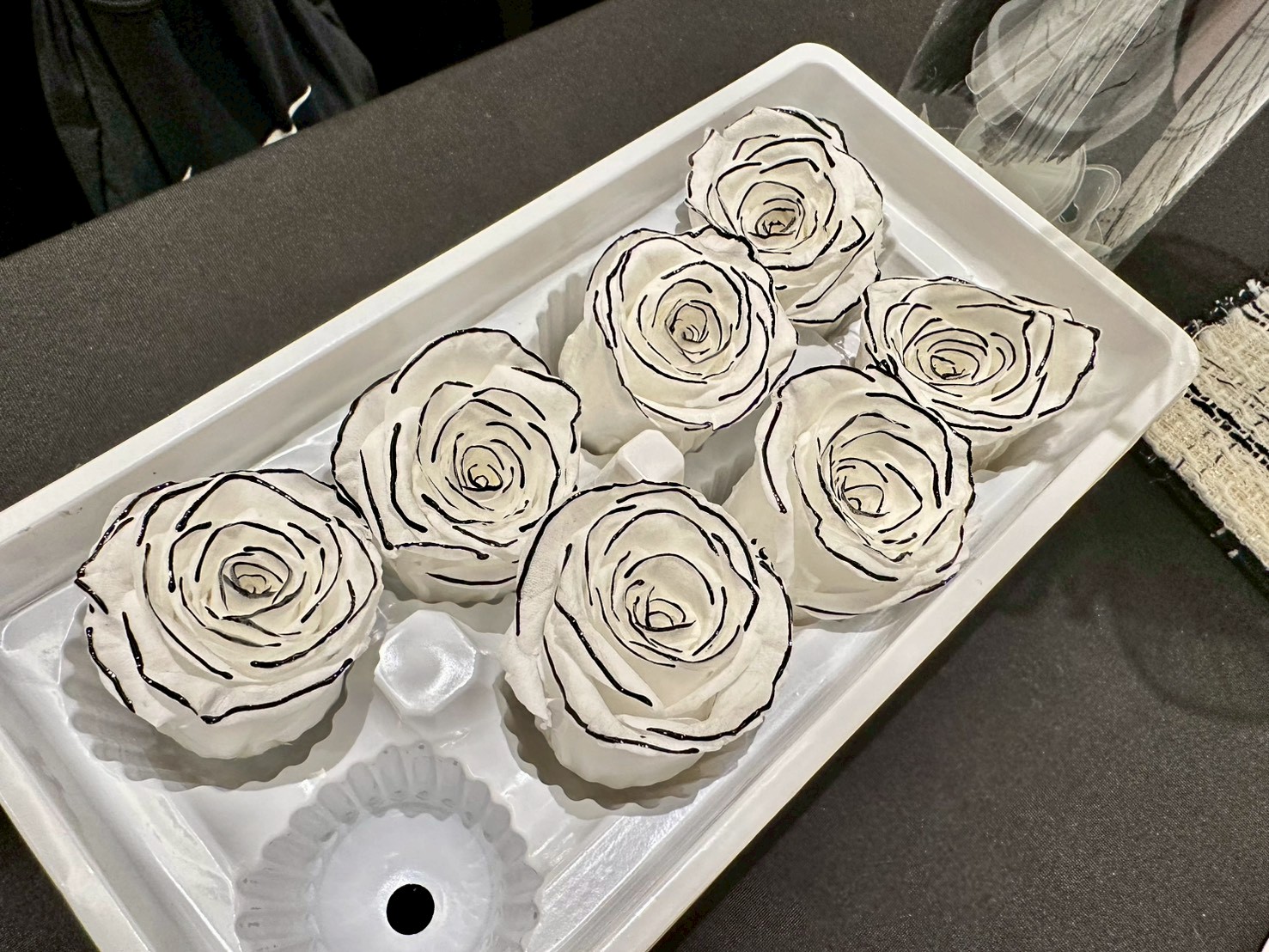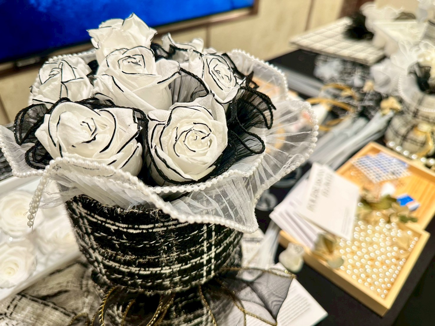 使用純白永生玫瑰,搭配小香風的布材、蕾絲、裝飾物 交織成一束極具質感的小香風玫瑰花束 米白色玫瑰滾上黑邊,香奈兒配色完全的經典 放置於家中,也是極為優雅的裝飾物