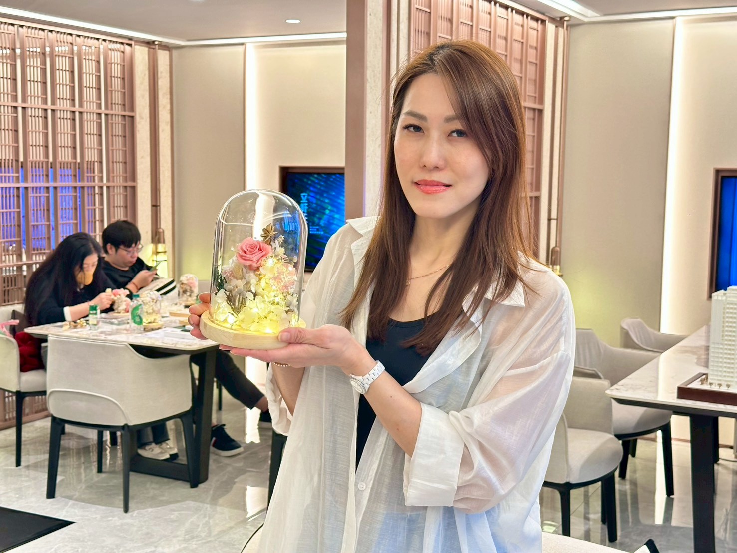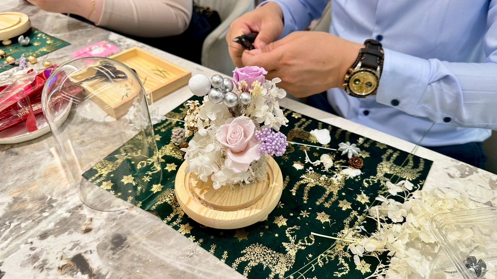 永生花最經典的作品「玻璃罩花藝」Make a wish 由專業花藝師教你善用純白色,創作出具有層次的作品 彷彿一座迷你純白聖誕樹一般,增添氣氛創造美好的聖誕時光